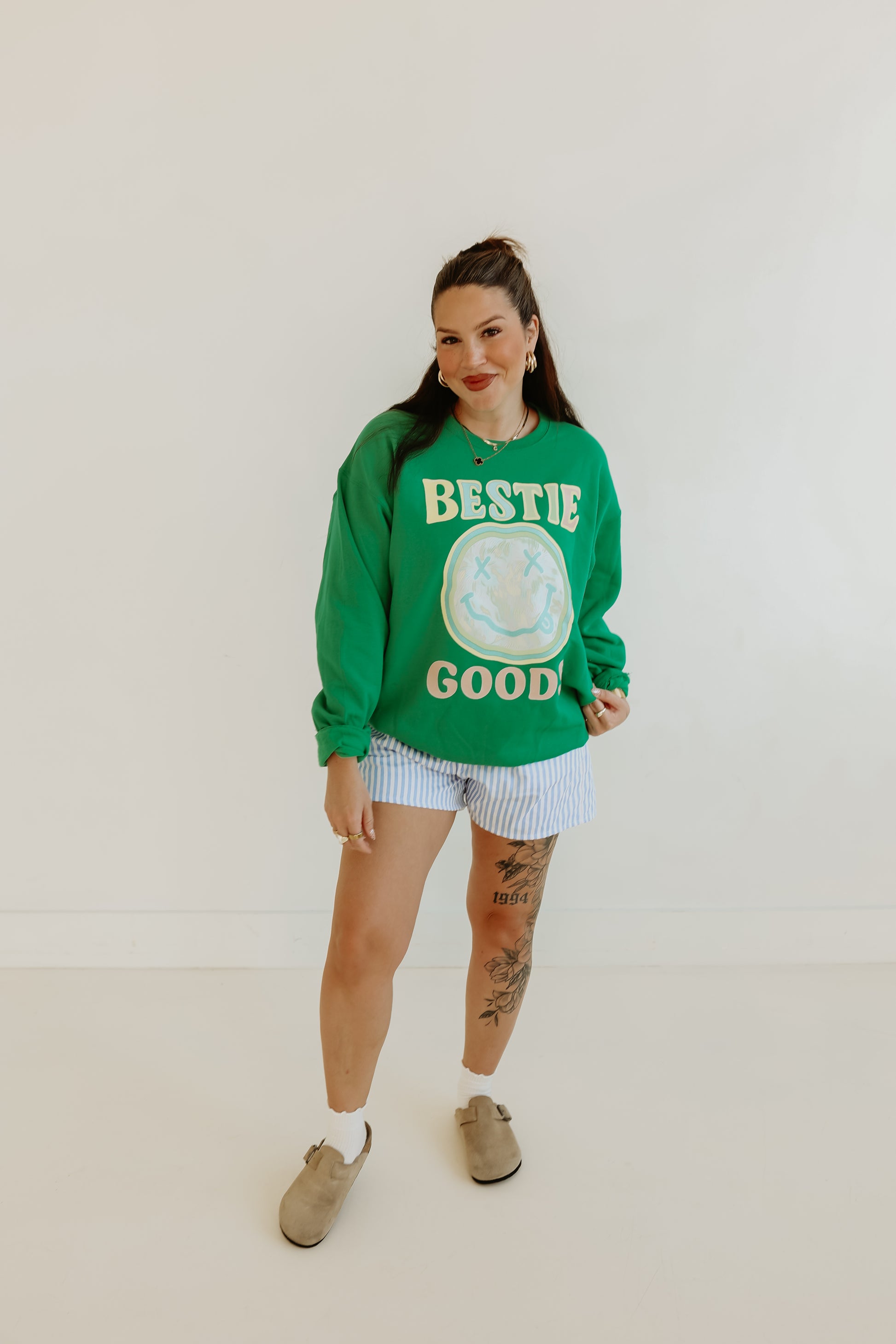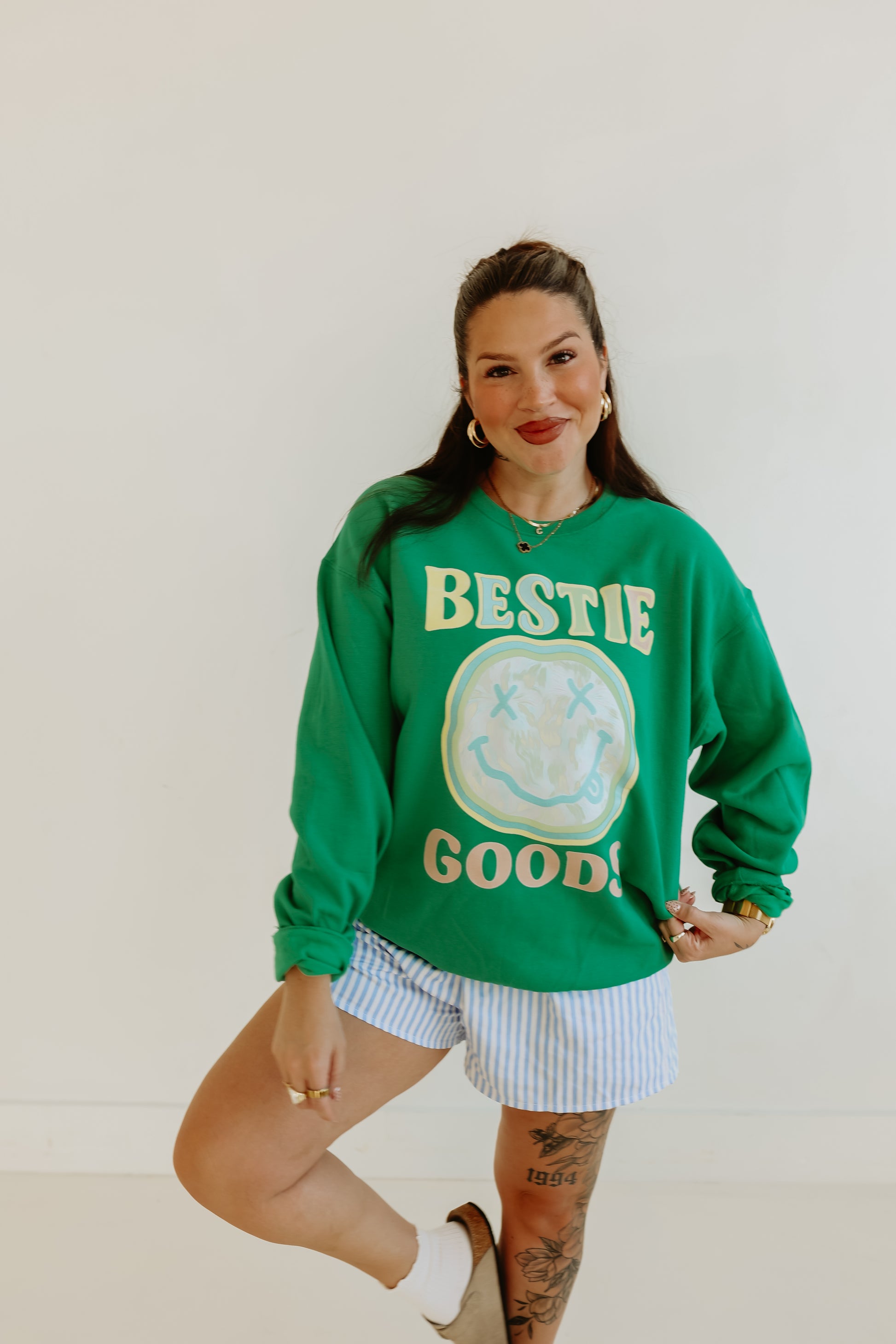 The Drip Smiley Crewneck is your new favorite throw-on-and-go piece. Featuring our playful smiley graphic with a slight distressed finish, it has that perfectly lived-in, vintage vibe you’ll want to wear on repeat. Topped with the bold Bestie Goods logo, this crewneck is equal parts cozy and cool.